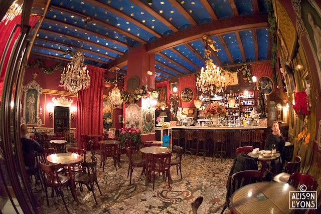 Fabulous Trompe-l’œil paintings adorn crimson walls and massive Baroque floral arrangements dominate the bar. I gaze at the Chandeliers and golden statues of cherubs as the compelling notes of